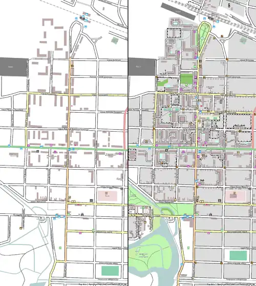 Вышний Волочёк — город малоэтажной застройки. При этом все основные магазины и другие заведения сконцентрированы вдоль трассы, всего в нескольких кварталах. Поэтому в пироге куски двух типов: классические, где нужно обойти несколько кварталов, и малоэтажные, где нужно пройти вдоль улиц и собрать адреса с немногочисленными POI.