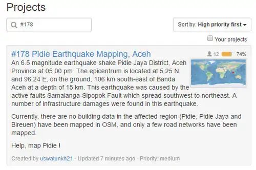 The Humanitarian OpenStreetMap Team Indonesia responded to this by launching a tasking manager for Pidie Jaya Area and mobilize volunteers, both from home and internationally: http://tasks.openstreetmap.id/project/178#instructions. In 6 days, over 70% with 409 tasks were mapped by more than 90 volunteers. Up untill now (December 21st 2016), 82% of the tasks have been completed and 8% validated.