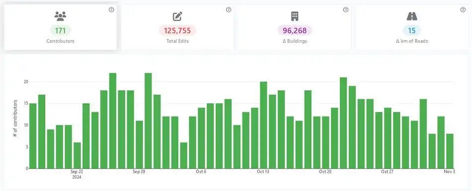 In total 171 contributors made over 125,000 edits to OSM including mapping over 96,000 buildings as part of this campaign. (See ohsomeNow Stats page for tracking overall contributions)