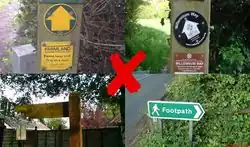Typically marked by signposts bearing yellow arrows, wooden pointers, or yellow waymark arrows attached to posts. Look out for the words "public footpath" on the guidepost or on the surround of the waymark arrow to be certain that the way can be tagged as a public footpath:
