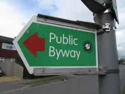 Known formally as Byway Open To All Traffic (BOAT), byways are public highways maintained to a lesser standard than normal roads. Some may have perfect tarmac surfaces (highway=service) but typically they are rough farm tracks (highway=track). They are rare, making up only 2% of public rights of way. To tag as a right of way look for the words "public byway" on the guidepost. Ways signposted simply "byway" may also be tagged if the sign also carries a red arrow.