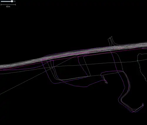 Firstly, look at the many white lines towards the top of the image. This is an east-west road, with a spacing between carriageways of around 5 m (meters). These are traces from a Navigo 3100 GPS. Over many journeys over some months with one GPS, the overall error becomes clear. The white lines should be in two strips around a meter wide, spaced by 4 m or so.