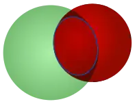 If the GPS unit only receives a signal from the "Green" satellite, then it can only determine that its location lies somewhere on the sphere of all locations that are the same distance from the "Green" satellite (as shown as the green sphere in the diagram above). Now consider the case when the GPS unit receives signals from both the "Green" and "Red" satellite. As before it determines its distance from each satellite. As we have received two signals we can narrow the location down to those points where the two individual distance spheres intersect. This means the location must be somewhere on the blue circle as shown in the diagram. |