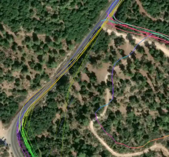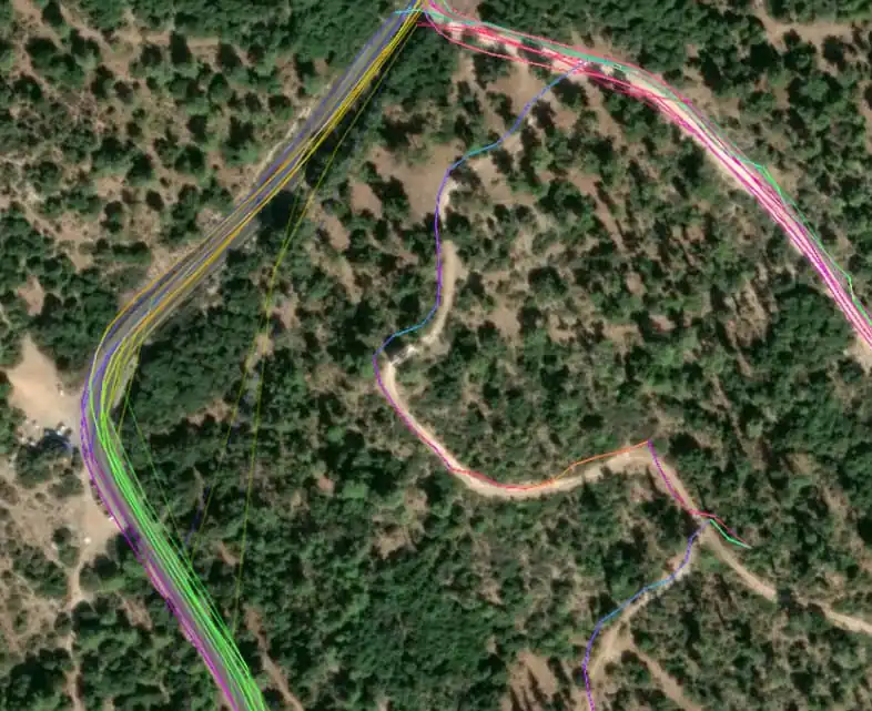 Note that even in the good example above, some GPS tracks are not well-aligned with roads, for example, the GPS trace on the middle dirt track. This might be a GPS measurement inaccuracy, or a track measured on a road which has changed since the measurement. When aligning the aerial imagery, align it with what the majority of the GPS tracks agree on.
