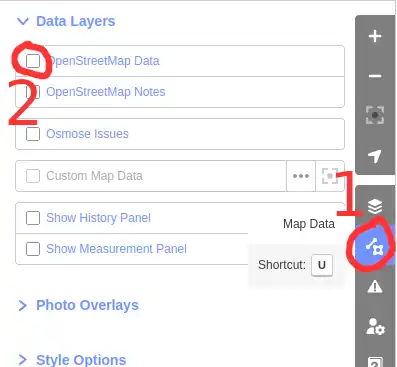First, it's recommended to temporarily disable the data layer to make the aerial layer more visible. click the "Map Data" button on the right (keyboard shortcut: U)