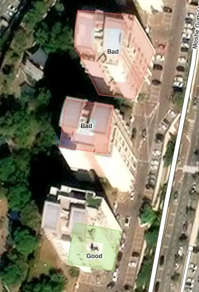 Aerial imagery is often not completely vertical. When mapping a building, you need to outline the ground floor. In the next example, only the bottom building is properly outlined.