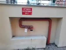 Un attacco di mandata sottosuolo, sotto un coperchio di metallo. Difficile capire il tipo e le dimensioni degli attacchi o le chiavi necessarie, senza aprirne il coperchio. E' necessario osservare attentamente il coperchio. Ci sono altri tipi di oggetti nascosti sotto coperchi simili, come punti di misurazione, valvole di intercettazione o tubazioni del gas (sul cui coperchio si legge "GAS"). |