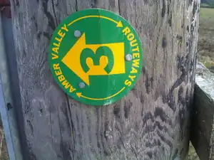 A series of numbered routes ("Amber Valley Routeways") are signed locally ([1]). Walks have green signs, rides (presumably designed for horses) blue:
