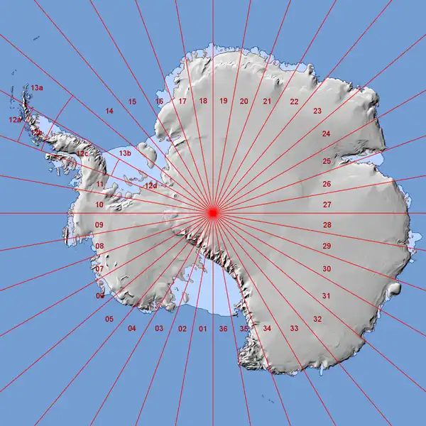 The ADD data is quite detailed so even for only the coastlines it would need to be imported in smaller parts. Since in most parts of the continent the data is concentrated near the coastline it makes most sense to split it into longitudinal segments for import. At the Antarctic peninsula where data is more detailed then elsewhere data is further split by latitude. See the map on the right for details on the tiling scheme.