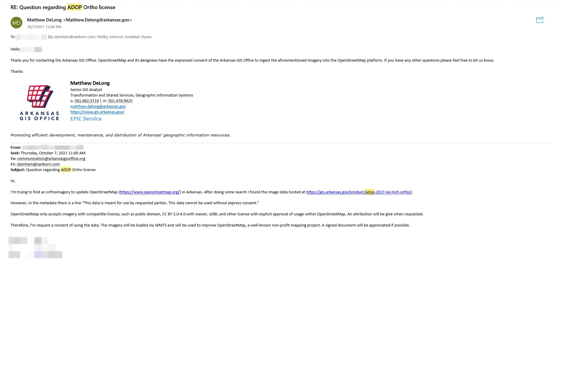 Arkansas GIS Office Senior GIS Analyst Matthew DeLong has approved the ADOP imagery usage in OpenStreetMap. A proof has been obtained and uploaded to the OpenStreetMap Wiki.