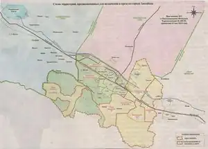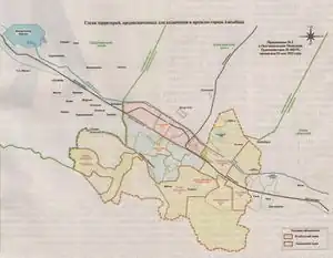 In 2019 the Turkmen government revealed plans to construct a massive residential and business zone north of downtown Ashgabat, to be called "Ashgabat City" (Turkmen: Aşgabat-Siti). The project is to cover 744 hectares and to include "over 200 buildings, 180 of which will be residential buildings of 12 to 35 stories. The district, where four secondary schools and the same number of kindergartens will be, is designed to house over 107 thousand people" in 17,836 apartments.[6][7][8]