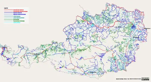 | EV9a | Bernsteinradweg, alternativer Verlauf | Niederösterreich, Wien | 54 km | 1196886 |