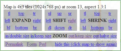For Bigmap or Bigmap 2 the initial step is to select an area and 'submit' this. The second stage allows the selection of the specific tiles required using the interface pictured here. The 'Expand' option selects additional tiles beside those initially shown. The 'Shrink' option removes tiles from one edge of the selection. The 'Shift' option moves the selection area north/south/east/west. The 'Zoom' option changes the zoom level of the tiles selected.... with the 'double size' 'keep size' or 'half size' options determining whether the number of tiles in the selection increases or decreases with the zooming (given zooming can either involve an increase/decrease in the number of tiles selected or an increase/decrease in the area selected). Specifically the 'double size' 'half size' options keep the same area selected (so the number of tiles selected changes), whereas the keep size options zoom the selected area (so the selected area changes - with the number of tiles staying the same as a result).