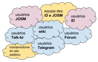 Podemos adotar como ponto de partida o fato de que as pessoas desta comunidade podem assumir dois papeis distintos: de usuários da infraestrutura OSM, que podem inclusive colaborar como mapeadores; e o papel de comunicadores, articulando-se através de canais de comunicação.