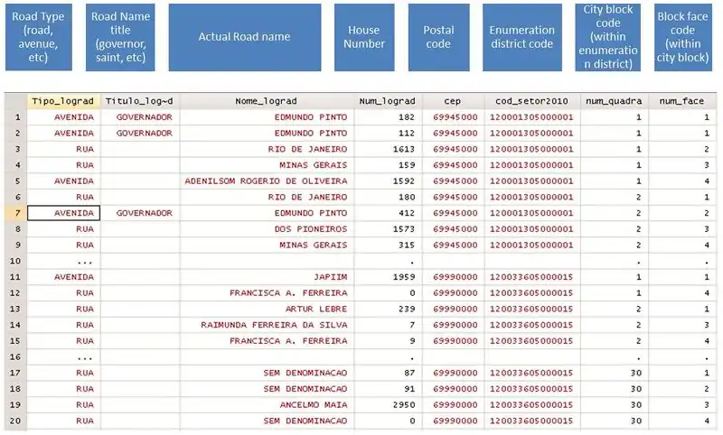Warnings and problems with the dataset: a) Addresses were recorded by enumerators to facilitate Census operation. IBGE does not guarantee the accuracy of the dataset. Streets naming is a municipal attribution, not under the jurisdiction of IBGE, the federal stats agency. Furthermore, IBGE mentions that it does not curate the addresses recorded by enumerators. There are cases of differences in spelling of street names In order to conflate the dataset into a street names dataset these differences in spellings must be identified (by some sort of fuzzy/Levenshtein string matching).