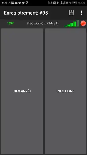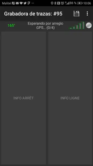 On ouvre l'app osmtracker et fait click sur le button + pour commencer la trace de la ligne, avant que le bus part. On doit attendre pour que le GPS prend la position actuelle: