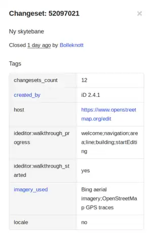 imagery_used=*– indicates which imagery was being displayed in the editorsource=*– specify the source for the edits that have been made in this changesetbot=yes– for automated edits, performed by a program (a.k.a. script or bot)locale=*– stores the language used by the editor (JOSM for instance usescreated_by=JOSM/1.5 (13367 en)with the last letters indicating the language).review_requested=yes– allows a user to request someone to review the changeset. iD and JOSM have an option to insert this tag and OSMCha (and other tools) identifies it and makes it possible to find changesets with this tag. See also a blog post about it.data_used=*– indicates which Esri/ArcGIS Datasets were used while editing using Rapid
