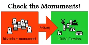 CheckTheMonuments is a map which is primarily intended as quality control tool for historic objects. Objects in OpenStreetMap have frequently been tagged as Monument either out of ignorance or because the proper tags were not yet defined when the objects were tagged. As a result of this, we find over 5,000 objects have been tagged as monument in Germany alone. When we look closer, many of those objects should be tagged differently. The CheckTheMonuments map will highlight all objects tagged as monument and support the mappers in their attempt to correct the situation.