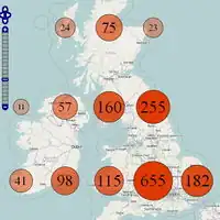 Circled numbers: These are displayed for zoom levels 3-11. The values are updated daily (see Historische Objekte#Update) and stored on the server as a csv file. The values are recalculated for every zoom level for square areas. The position of the circles on the map is predetermined by the location of the square areas. The size of the circles is dynamically adjusted to match the values. For a zero value, no circle is created. Zoom levels 1 and 2 are not supported.