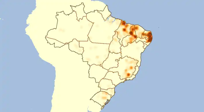 Mapa de calor mostrando a localização das cidades obtidas no segundo método, porém antes do descarte das repetições.