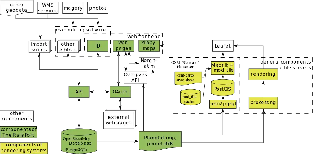 The website's main function is to display the Slippy Map (view tab), and the online editor iD (edit tab), but it also deals with logging in, registering, user pages, GPS traces, user diaries, data browser and other raw data 'browse' views, and changeset history views.