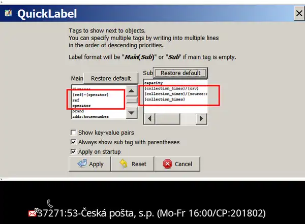 - zobrazení: ref-operator (collection_times/source:collection_times) zobrazuje některé dodatečné údaje pro mou potřebu, které před nahráním dat mažu a tag source:collection_times, který odkazuje na datum souboru České pošty pro kontrolu aktuálnosti doby výběru schránky