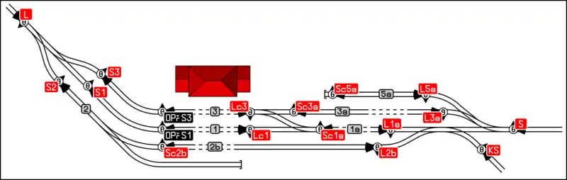 Rozmístění a znační návěstidel malého nádraží. Pro zjednodušení a přehlednost jsou zakreslena pouze hlavní návěstidla (a předvěsti) pro jízdu vlaků, seřaďovací návěstidla nejsou zakreslena.