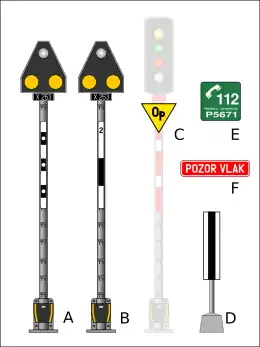 • Provedení: A,B: Dvě žlutá světla neb odrazky vedle sebe, bílé světlo jako vrchol trojúhelníku, svitem indikující stav, C: reflexvní trojúhelník s nápisem Op, D: reflexní deska postavená na výšku, E: tabulka s číslem přejezdu a F: výstražná tabulka.