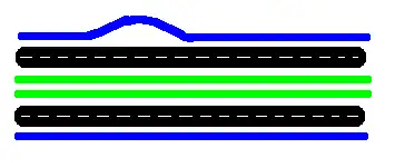The two green ways are the tram, on both sides there is a secondary road (two lanes each side), and next to them there are two cycleways, the top one having some oddities: First it's departing a little bit from the road and getting back there, second on the right side, it's twoway, on the left it's only oneway.