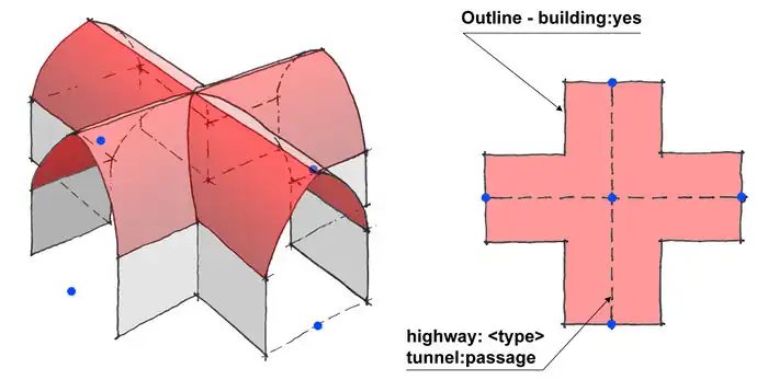 Durchfahrt ist eine (üblicherweie erdgeschossige) Öffnung in dem Gebäude. Sie muß für die 3D Darstellung getaggt werden mit: