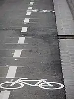 Radfahrstreifen Ein Radfahrstreifen ist ein mit Zeichen 237 (Radweg) gekennzeichneter und durch Zeichen 295 (durchgezogene breite Linie) von der Fahrbahn abgetrennter Sonderweg. Er kann zusätzlich mit dem Sinnbild „Fahrräder“ gekennzeichnet sein. Eine bauliche Trennung (weder deutsch-amtlich noch im OSM-Sinne) ist nicht vorhanden, der Radfahrstreifen wird daher ausschließlich als Schlüssel am Highway erfasst. |