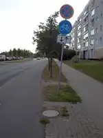 Gemeinsamer Geh- und Radweg ohne Benutzungspflicht Baulich getrennt von der Fahrbahn und mit Symbol „Fußgänger“ über „Fahrrad“ (getrennt durch einen waagerechten Strich) markiert. |