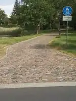 Getrennter Rad- und Gehweg am Fahrbahnrand Fußgänger und Radfahrer sind optisch voneinander getrennt (Linie, farbiges Pflaster, usw.). Eine bauliche Trennung, z.B. durch einen Bordstein im deutsch-amtlichen Sinne liegt vor, jedoch nicht im OSM-Sinne (siehe oben). Der Fußweg wird durch weitere Schlüssel am highway beschrieben. |