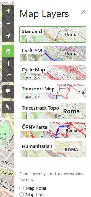 Man kann verschiedene sog. Kartenebenen (auch Layer genannt) wählen, die verschiedene Ansichten der gleichen Daten bieten. Dies kann durch Klicken des »Ebenen«-Icon (7) bewirkt werden.