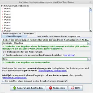 Wenn du einen Änderungssatz hochlädst und einen Änderungssatz-Kommentar angibst, schließt der Editor den Änderungssatz nicht immer sofort, und folgende Bearbeitungen könnten zu dem gleichen Änderungssatz hinzugefügt werden und daher auch den selben Änderungssatz-Kommentar haben.