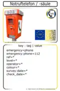 | Diese Seite wurde einst nach bestem Wissen und mit Sorgfalt zusammengestellt. Weil aber die Systematik von OSM ständig in Bewegung ist, und weil auch die vorliegende Seite wie alle Seiten im Wiki von verschiedenen Autoren gepflegt wird, kann es durchaus des Öfteren zu Unstimmigkeiten kommen. Teilweise werden hier Attribute (englisch tags) empfohlen, die nicht der allgemeinen Attributierungspraxis entsprechen. Einen guten Anhaltspunkt zur Überprüfung, ob ein Attribut im System von OSM etabliert ist, bietet die Seite taginfo.openstreetmap.org |