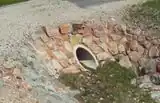 - Ein Betonrohr, durch das ein Bach fließt und über das ein Weg führt.