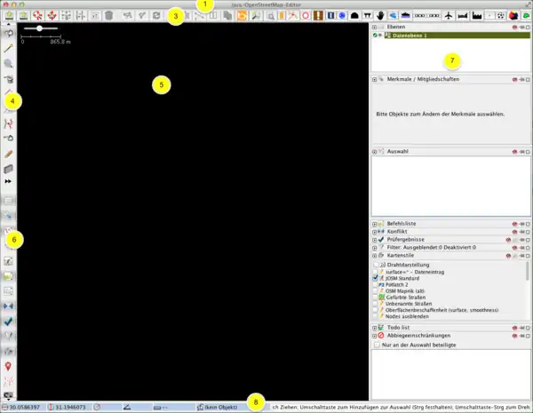 Sind die gewünschten Daten erfolgreich geladen, geht es ans Editieren. Doch bevor es ans Eingemachte geht, zunächst mal ein kleiner Überblick über die JOSM-Fensteranordnung in der Standardeinstellung