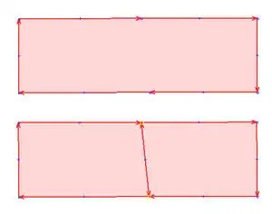 Diese Funktion ermöglicht es, ein Flächenobjekt über zwei, in der Flächendefinition enthaltende, Nodes aufzuteilen. Hierzu sind das Flächenobjekt sowie die beiden "Split"-Nodes auszuwählen. Mit dem Funktionsaufruf (Tastaturkürzel Alt+X) wird das Flächenobjekt aufgeteilt. Die Eigenschaften des ursprünglichen Objektes werden auf die beiden neu enstandenen Objekte übernommen.