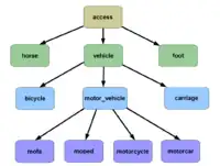 Zur Angabe eines Verkehrsmittels wird der Schlüssel access=* durch Gruppenschlüssel (z. B. vehicle=* für alle Fahrzeuge) oder Einzelschlüssel (z. B. bicycle=* für Fahrräder) ersetzt. Dadurch können unterschiedliche Zugangsarten getrennt angegeben werden. Die Gültigkeits-Vererbung zwischen Gruppen, Untergruppen und einzelnen Verkehrsmitteln erleichtert die Angabe der Beschränkung.