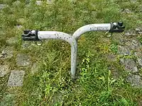 Eine Metall-Struktur mit Haltern für Fahrradlenker. Das Fahrrad steht üblicherweise nicht vollständig auf dem Boden, wenn es geparkt wurde. | ![]()