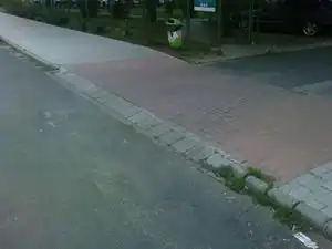 Ein Bordstein für Ein- und Zufahrtenfahrten, die mit Fahrzeugen und Fahrrädern befahrbar sind, aber nicht mit Rollstühlen, da sie zu hoch sind. Impliziert |