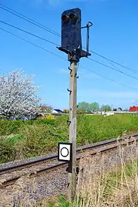 s.o. | Hl-Vorsignalwiederholer werden mit einer weißen Tafel mit einem schwarzen Kreis darauf gekennzeichnet. | |