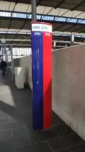 An einer Informationssäule können Reisende mittels einer Gegensprechanlage Kontakt mit einer Zentrale des zuständigen Verkehrs- bzw. Infrastrukturunternehmens aufnehmen. Durch Drücken eines Knopfes wird eine Sprachverbindung zu einem Informationszentrum aufgebaut.