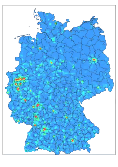 Im Jahr 2013 verteilen sich die ca. 50.000 Fehler über ganz Deutschland. Allerdings gibt es Bereiche, mit einer erhöhten Dichte an Fehlermeldungen. Die Heatmap auf der rechten Seite stellt die jeweilige Fehlerdichte farblich dar. Sie basiert auf einem Geofabrik Deutschland Extrakt vom 23.3.2013 und berücksichtigt ausschließlich Wege unter Brücken.