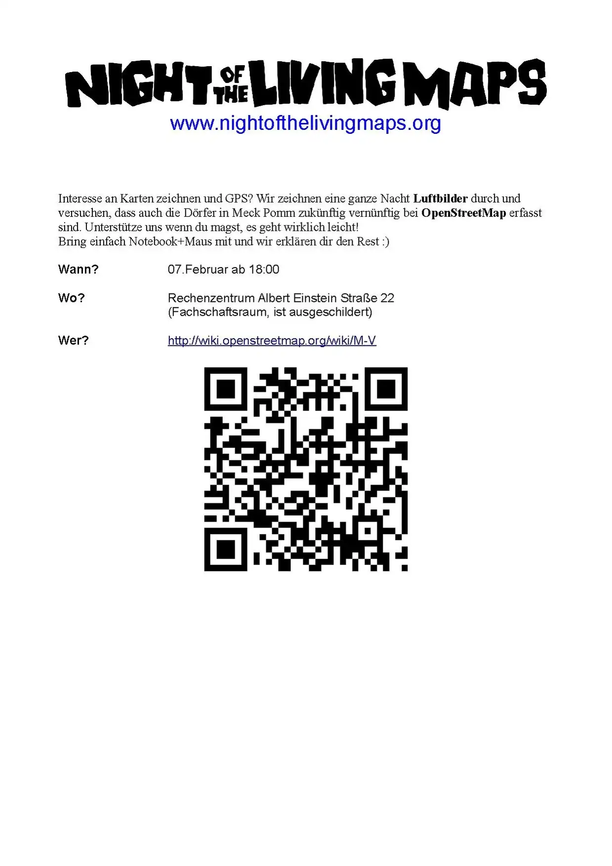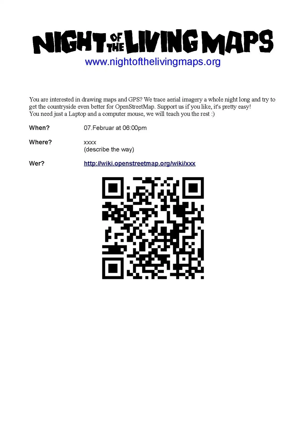 - Kontaktiere deine Local groups und füge Template:Night of the living maps auf eure Wiki Seite ein