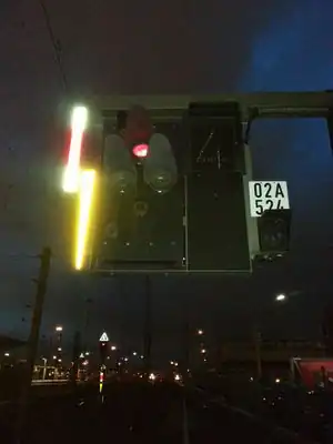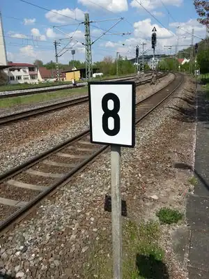 - anhand der Position zu einem markanten Objekt, beispielsweise einer bestimmten Brücke („Kilometer 55,2 hängt am Oberleitungsmasten nach der Brücke über die Straße xy“)
