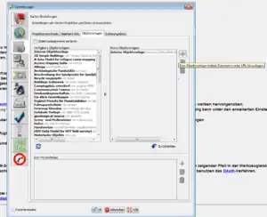 - Im linken Bereich sind unter „verfügbare Objektvorlagen“ die Objektvorlagen der OpenRailwayMap für die einzelnen Länder (getrennt nach Gleise/Bahnhöfe und Signale) zu finden. Die passenden Vorlagen markieren und auf das nach rechts zeigende Dreieck klicken.