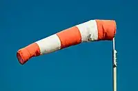 Windsack zeigt Windrichtung und -geschwindigkeit an. Dieser wird häufig an Flughäfen gefunden; manchmal auch in Fabriken, Häfen, Farmen und an Autobahnen.