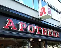 Apotheke gekennzeichnet. Apotheken sind Geschäfte, in denen hauptsächlich Medikamente verkauft werden. In Deutschland dürfen Apotheken nur von lizenzierten Apothekern betrieben werden. Geschäfte, die lediglich Pflegeartikel und grundlegende einfache Medizinprodukte anbieten, sind Drogerien und werden shop=chemist getaggt.